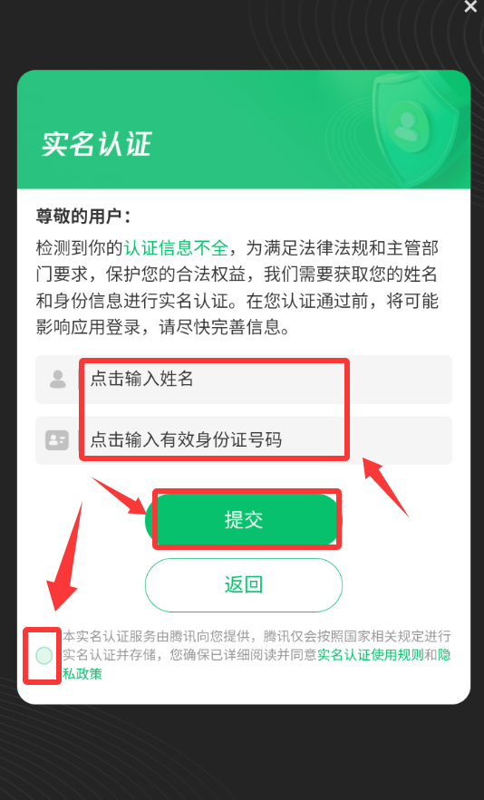2、點(diǎn)擊輸入真實(shí)姓名和身份證號碼然后點(diǎn)擊紅色框框里打√并提交。