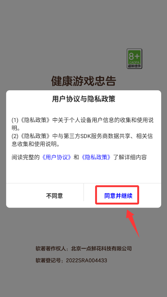 1、點(diǎn)擊用戶協(xié)議與隱私政策里的同意并繼續(xù)。