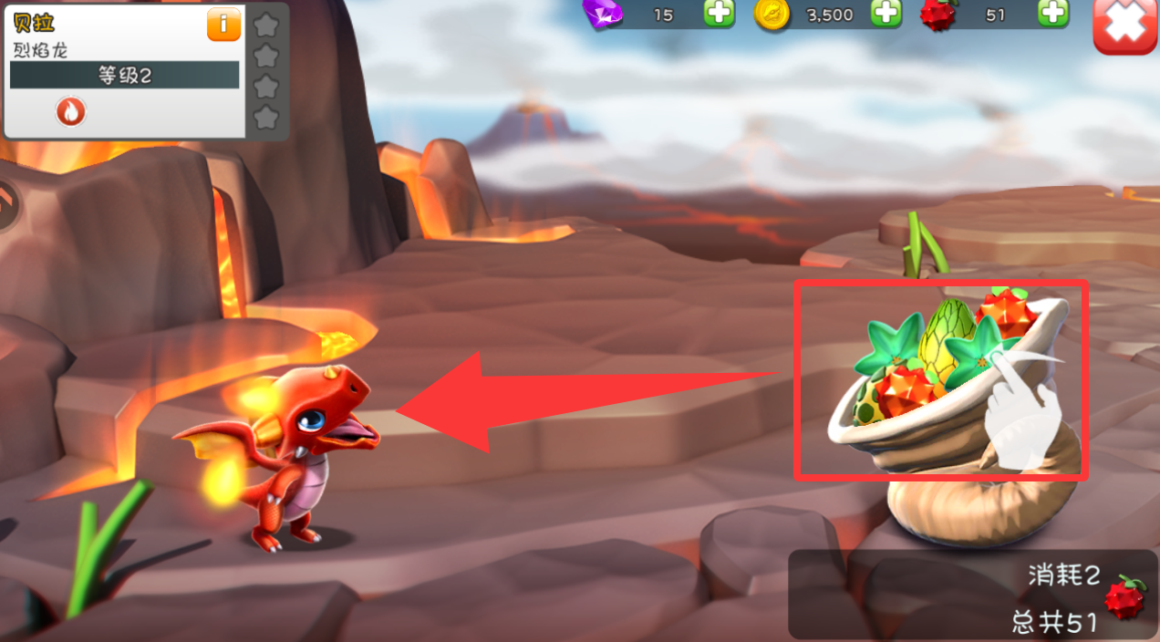 2、烈焰龍餓了,點擊右下角的喂食把它喂飽。