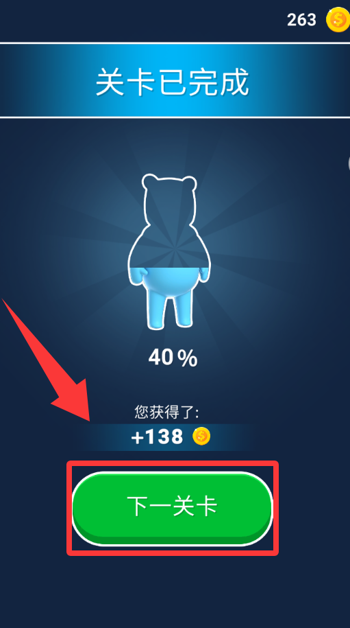 3、恭喜你過關(guān)了,點(diǎn)擊紅色框框里的下一關(guān)卡并繼續(xù)。
