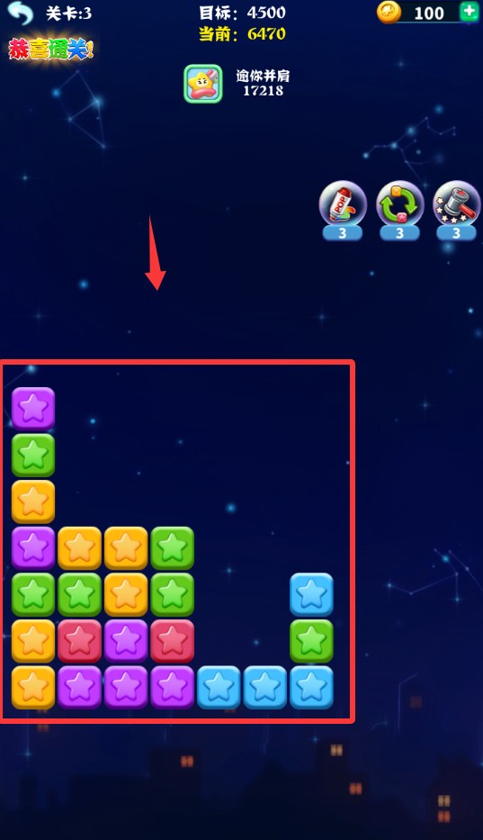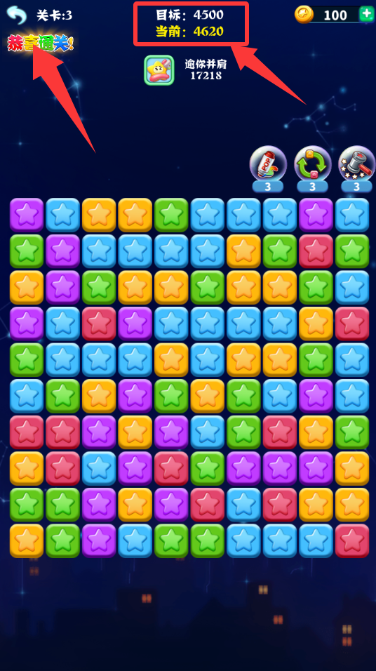 1、恭喜你通關(guān)了,上一關(guān)的分?jǐn)?shù)已經(jīng)超過(guò)了這關(guān)的目標(biāo)。