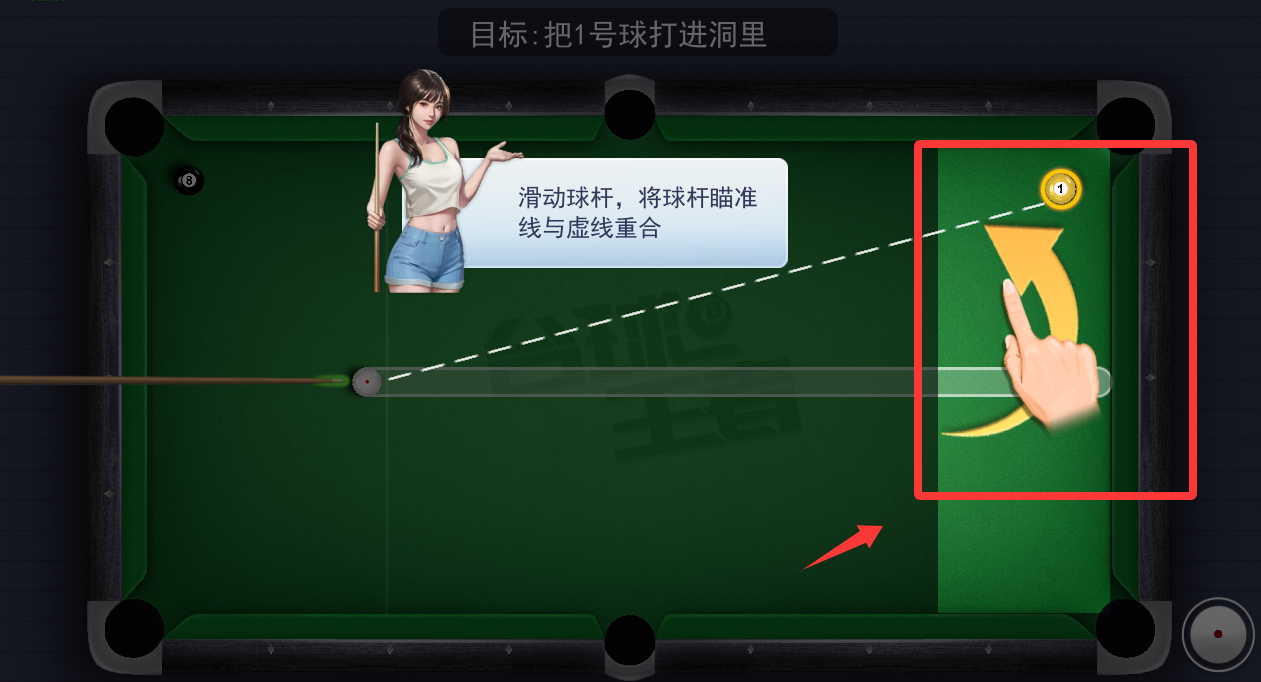 2、點(diǎn)擊滑動(dòng)球桿,將球桿瞄準(zhǔn)線與虛線重合。