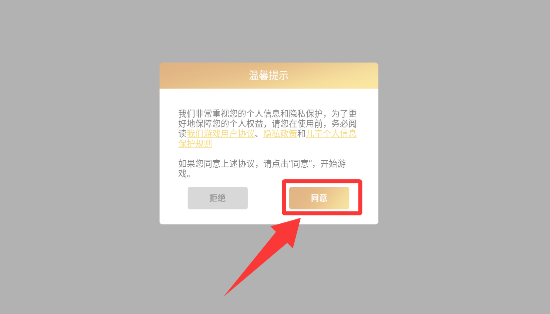 1、點(diǎn)擊溫馨提示里的同意并進(jìn)入游戲。