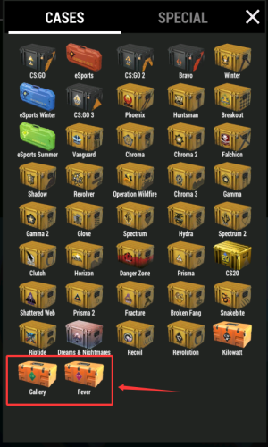 3、在特殊分類中,選擇畫廊或狂熱主題箱子。