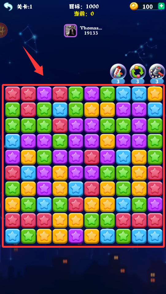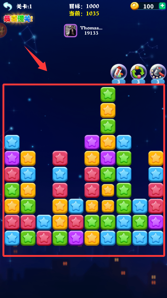 點(diǎn)擊單個(gè)星星即可消除,小關(guān)卡設(shè)計(jì),多種變量不同關(guān)卡,每次消除后,星星自動(dòng)由下向上上升一行,當(dāng)星星上升至最頂端時(shí),游戲結(jié)束。