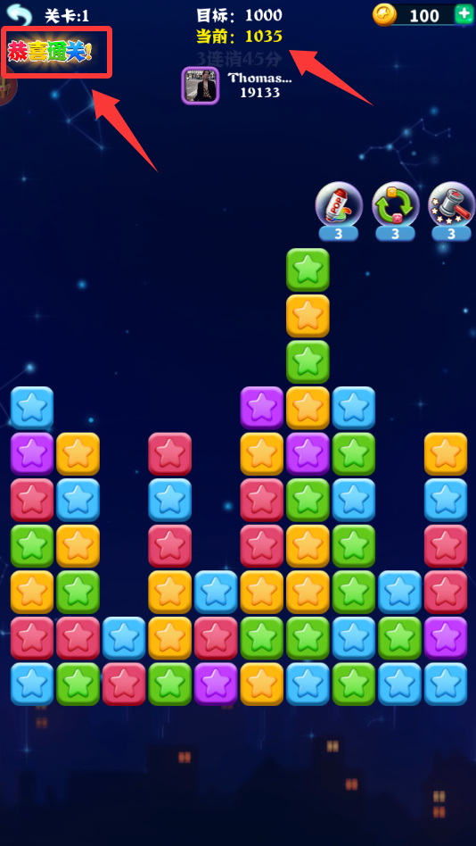2、恭喜你,通關(guān)了,目標(biāo)達(dá)到了1000分。