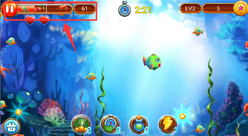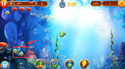 1、進(jìn)入游戲點(diǎn)擊長按控制魚的移動(dòng),移動(dòng)魚過去吃掉小魚。