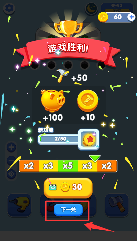 3、恭喜你通關(guān)了,點擊紅色框框里的下一個繼續(xù)。