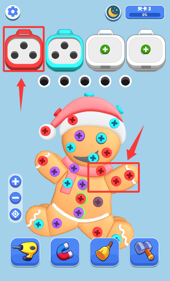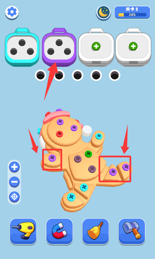 1、進入游戲把對應(yīng)顏色的螺絲擰下來3個就會消除。