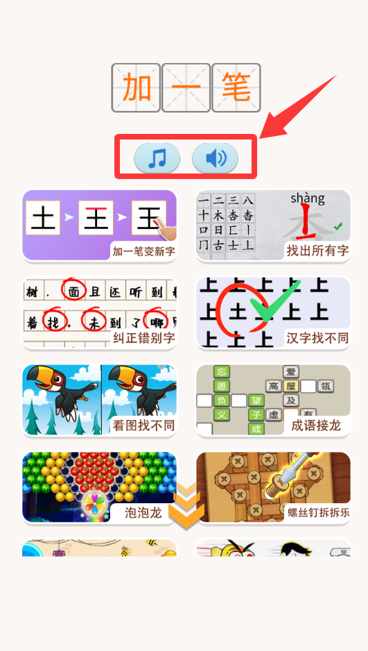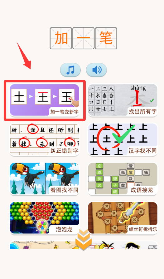 3、在游戲模式界面點(diǎn)擊第一個(gè)加一筆變新字。
