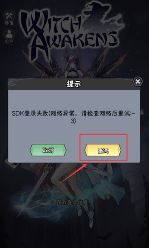 3、點(diǎn)擊黃色重試按鈕,在網(wǎng)絡(luò)異常后重新登錄。