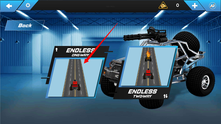 1、選擇心儀怪獸卡車并裝備武器開始競速挑戰(zhàn)。