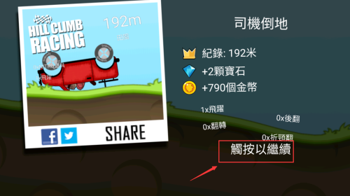 2、點擊紅色繼續(xù)按鈕,查看翻車后獲得的獎勵。