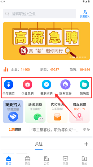 1、登錄應(yīng)用首頁(yè),可見(jiàn)急聘專(zhuān)區(qū)、全職崗位等入口,按需選擇功能模塊。