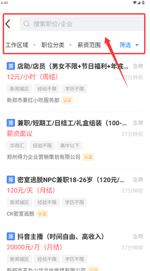 2、進(jìn)入兼職頻道,通過(guò)區(qū)域、薪資等篩選條件快速定位合適的工作機(jī)會(huì)。