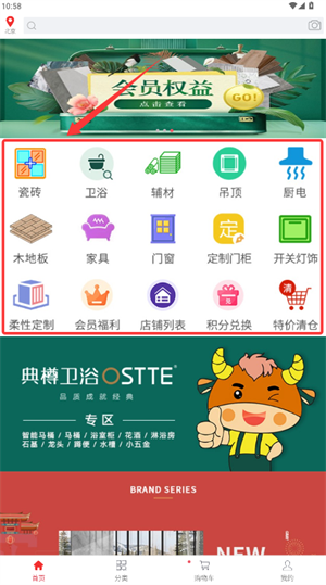 2、進(jìn)入首頁可見瓷磚、衛(wèi)浴等商品分類入口并按需選擇。