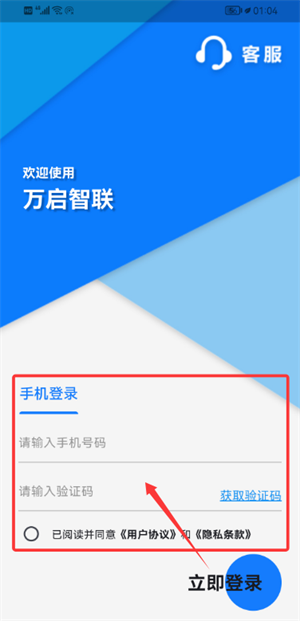1、啟動萬啟智聯(lián)應用,通過手機號及驗證碼登錄,并勾選用戶協(xié)議完成進入。
