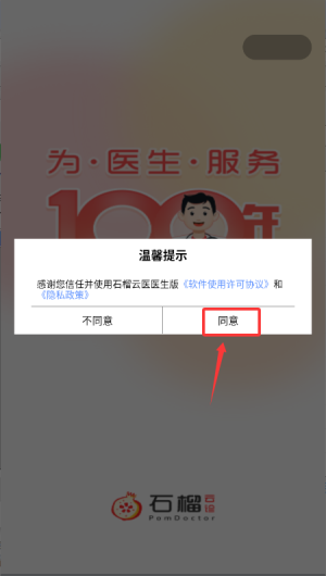 1、啟動石榴云醫(yī)醫(yī)生端,于溫馨提示頁點擊“同意”用戶協(xié)議。