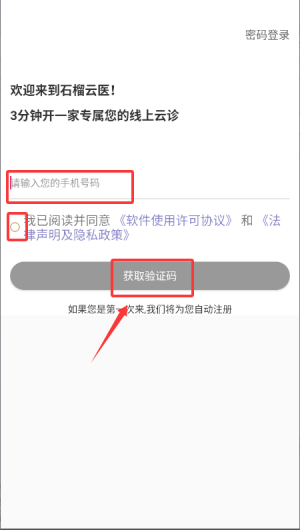2、在登錄頁填寫手機號并勾選同意選項,獲取短信驗證碼。