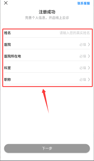 3、注冊完成後,補充姓名及執(zhí)業(yè)醫(yī)院等資料,點擊下一步繼續(xù)。