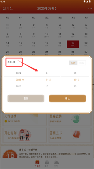 1、打開應(yīng)用,在日期選擇器中設(shè)定目標(biāo)年份、月份及具體日次并確認(rèn)。