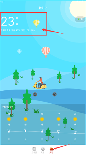 3、切換至天氣板塊,可查詢所在地實(shí)時(shí)溫度、風(fēng)力及未來24小時(shí)氣象預(yù)報(bào)。