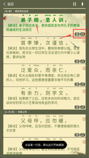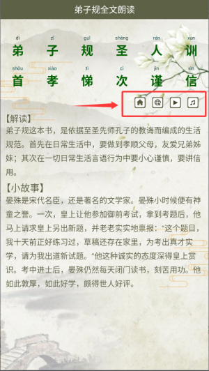 4.全文朗讀模式下的弟子規(guī)所有發(fā)音、拼音注釋、解釋等均可在不連接網(wǎng)絡(luò)的狀態(tài)下朗讀學(xué)習(xí)。