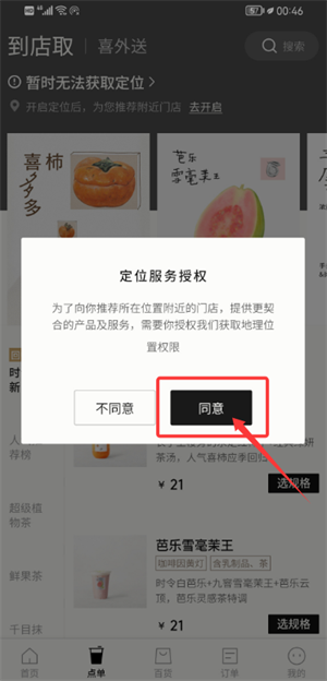 2、選擇自提模式后,授權(quán)定位服務(wù)以獲取附近推薦門店信息。