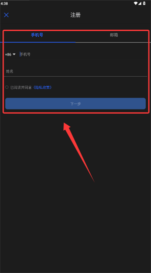 1、進入軟件注冊頁,填寫手機與姓名信息,勾選協(xié)議后點擊下一步完成注冊。