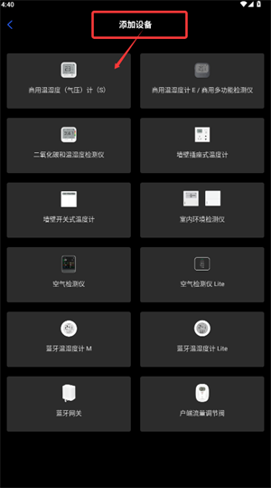 3、在設(shè)備添加界面,選擇需綁定的類型如商用溫濕度計等即可完成添加。