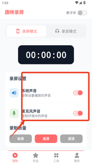 4.趣映錄屏自由設(shè)置錄屏參數(shù),選擇合適的分辨率、幀率、碼率進行錄制;