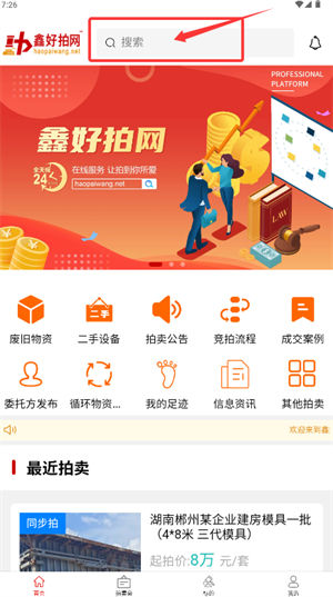 2、返回首頁(yè),在頂部搜索欄輸入拍賣品關(guān)鍵詞進(jìn)行精準(zhǔn)檢索。