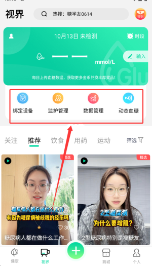 2、通過視界板塊可完成設(shè)備綁定操作,并實現(xiàn)健康監(jiān)護、數(shù)據(jù)管理與血糖動態(tài)監(jiān)測等功能。