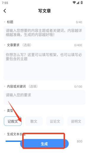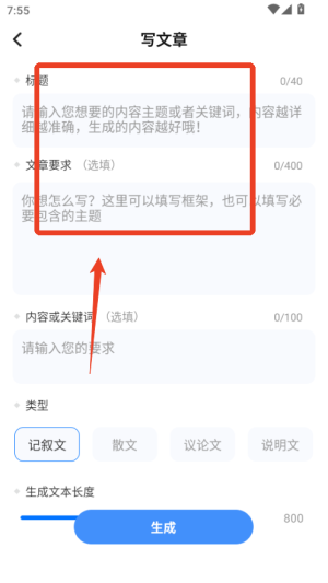 1、打開文章生成器app,在主界面輸入關鍵詞或主題,選擇所需的文章類型和風格。