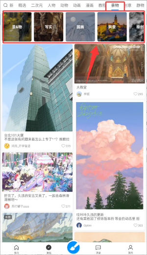 1、進(jìn)入應(yīng)用首頁(yè),選擇景物欄目可欣賞各類繪畫作品。