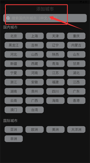 1、在添加城市頁(yè)面,可通過(guò)搜索框輸入或從國(guó)內(nèi)外城市列表中選擇目標(biāo)城市。