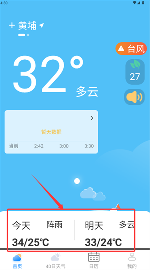 2、選擇完成后,界面將顯示該城市當(dāng)前溫度、天氣及未來(lái)兩天的天氣預(yù)報(bào)。