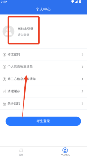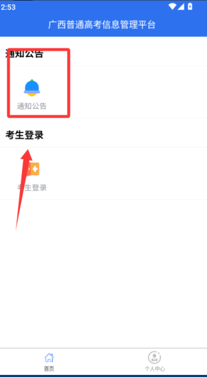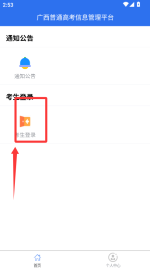 1、打開廣西普通高考信息管理平臺(tái)官網(wǎng)APP后,在“首頁”點(diǎn)擊“考生登錄”;