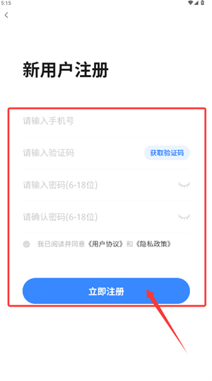 1、進(jìn)入新用戶注冊(cè)界面,依次填寫手機(jī)號(hào)碼、驗(yàn)證碼,設(shè)定并確認(rèn)登錄密碼后完成注冊(cè)。