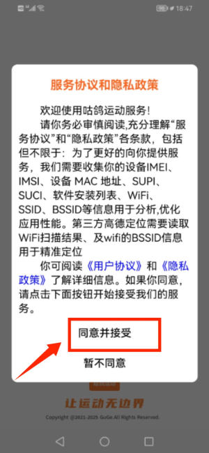 1、啟動應用后,在服務協(xié)議窗口點擊同意并接受,進入登錄頁。