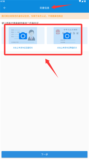 2、進(jìn)入資料完善界面,依次上傳身份證正反面圖像,完成實(shí)名認(rèn)證流程。