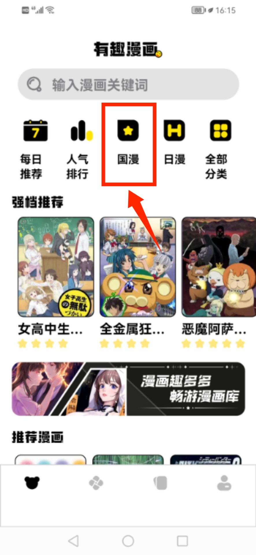 1、啟動應(yīng)用后,在主頁導(dǎo)航欄中找到"國漫"專區(qū)入口,點擊進(jìn)入分類頁面。