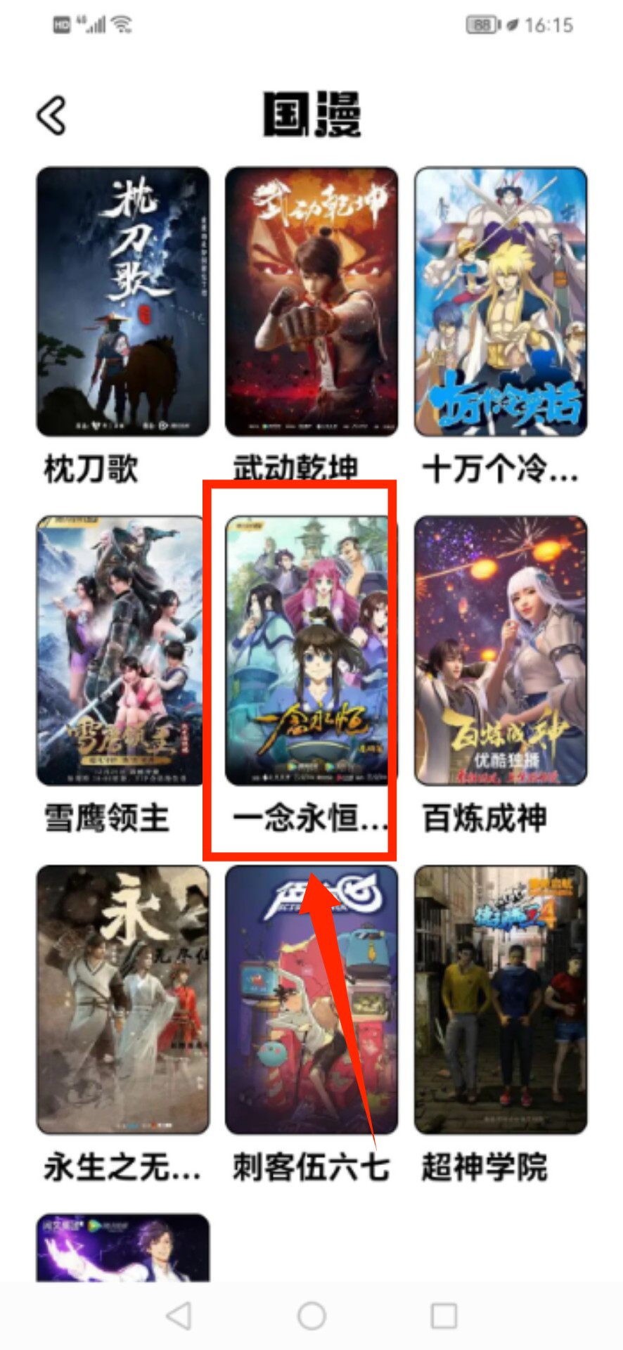 2、在國漫作品陳列區(qū),通過滑動瀏覽或搜索功能定位“一念永恒”系列作品。
