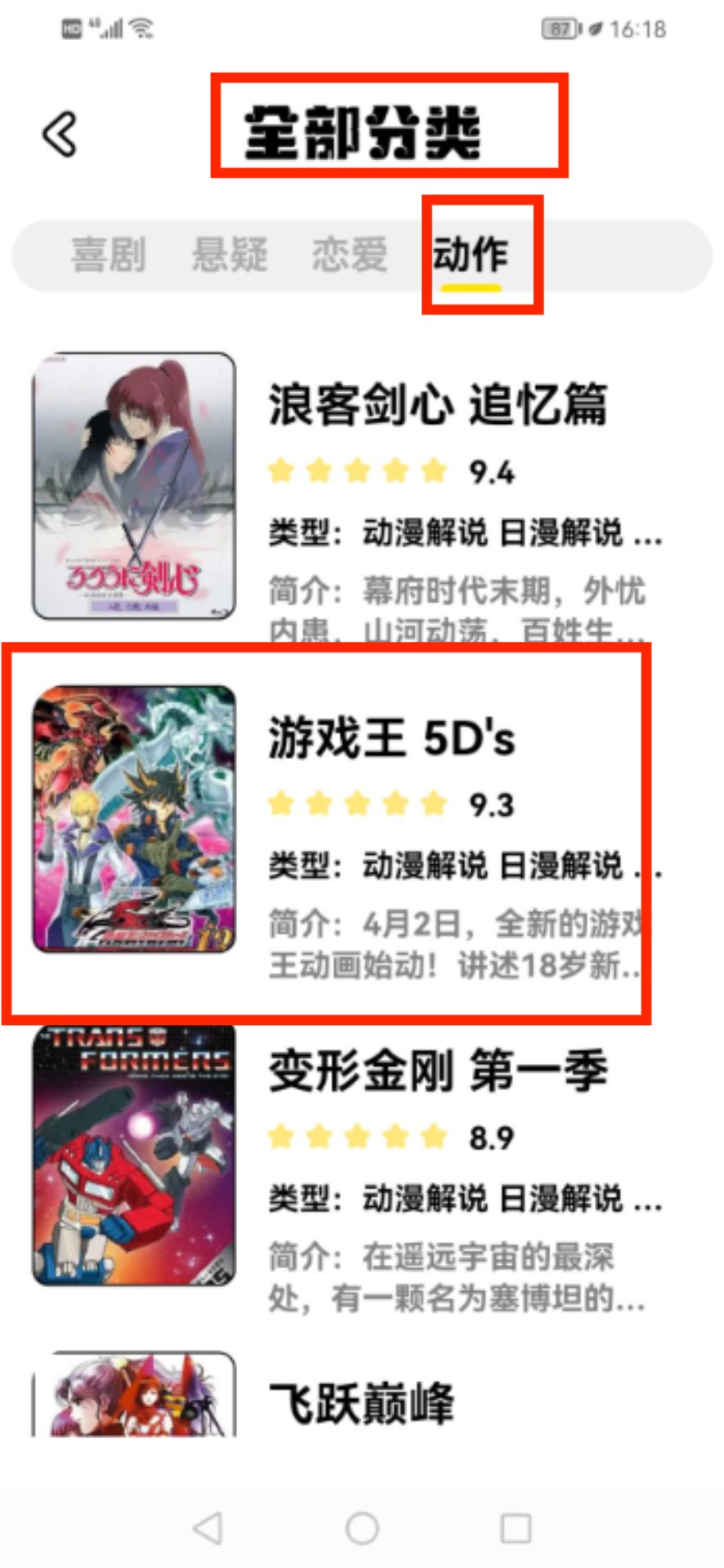1、啟動動畫應用后進入分類總覽界面,選擇動作類型并定位目標作品"游戲王5D's"。