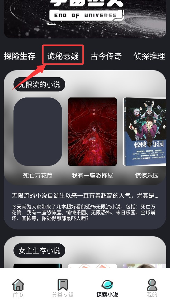 2、詭秘懸疑小說專區(qū)收錄各類推理驚悚題材作品,包含靈異事件與心理懸疑等細分類型。