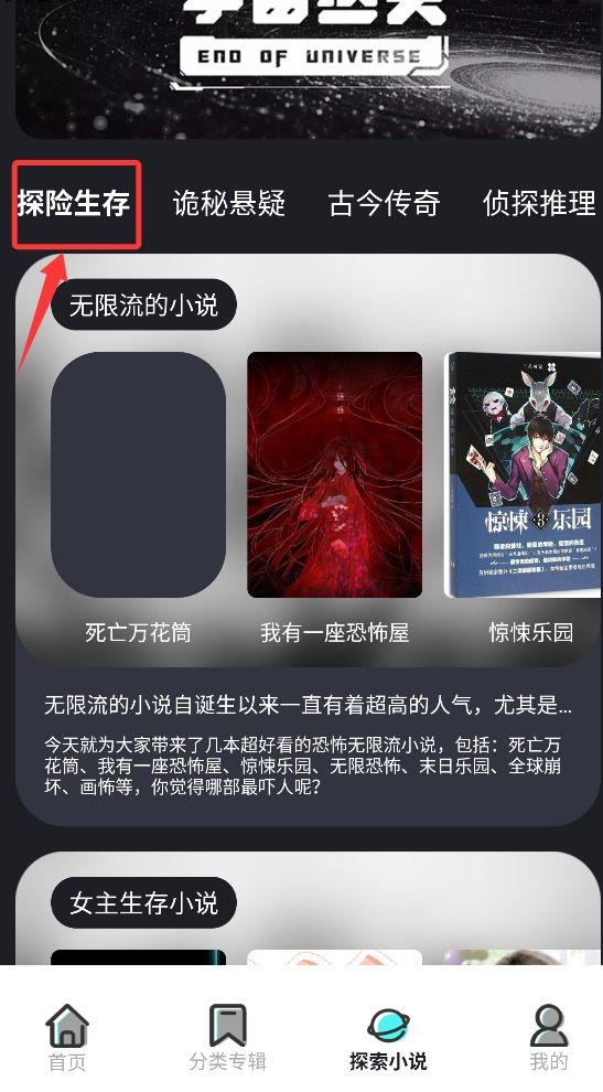 3、探險生存小說板塊聚焦荒野求生與秘境探索主題,提供充滿緊張劇情的冒險故事集。